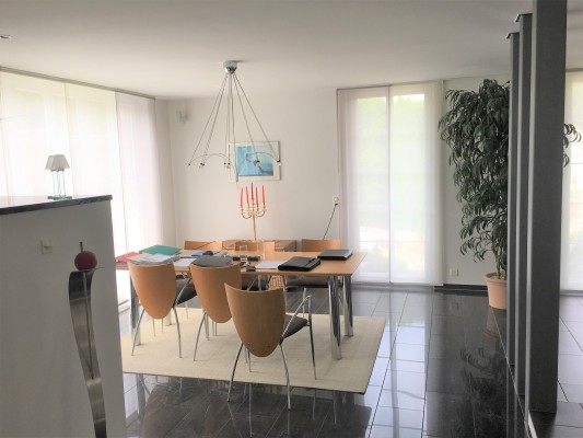 Wenn Sie nach Hause kommen, parken Sie in der grossen Doppelgarage Ihr Auto und befinden sich bereits im Untergeschoss Ihres Hauses. Neben dem Technikraum und den üblichen Kellerräumen ist hier ein helles Zimmer/Büro mit Fenstern gegen Norden realisiert worden. Eine moderne Treppe führt ins Erdgeschoss.