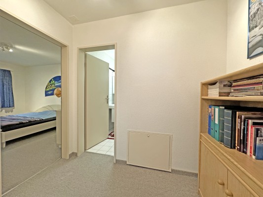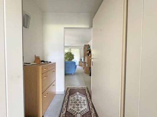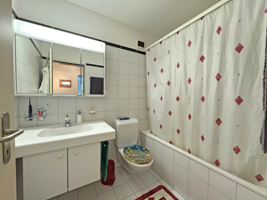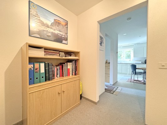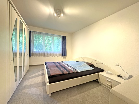 Ein geräumiges Schlafzimmer und ein zeitloses Bad mit Badewanne, Lavabo mit Unterschrank und WC runden das Wohnangebot ab. Im Untergeschoss dürfen Sie ein Kellerabteil, ein Bastelraum sowie ein Tiefgaragenplatz Ihr Eigen nennen. Im gemeinsam genutzten Waschraum steht ihr persönlicher Waschturm.