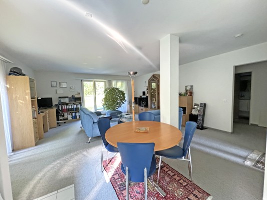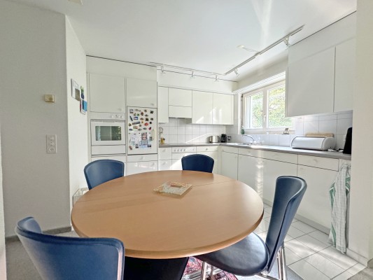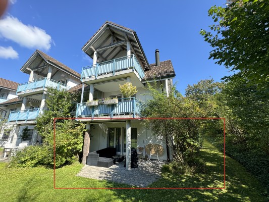 Auf dem Sitzplatz mit der schönen Grünfläche können Sie ihren «Fyrabig» geniessen. Eine gemütliche, praktische und helle Single-Wohnung bietet sich hier zum Kauf an.