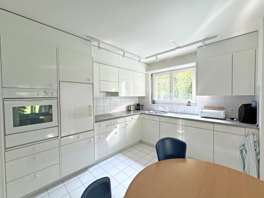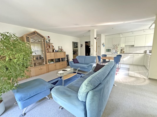 Die Wohnung befindet sich im Erdgeschoss und ist über die Tiefgarage oder über die Seewadelstrasse erschlossen. Das Wohn-/Esszimmer mit direktem Zugang zum Sitzplatz wird durch die raumhohen Fenster erhellt. Die Küche, mit Standardausbau, ist gegen den Wohnraum offengehalten.