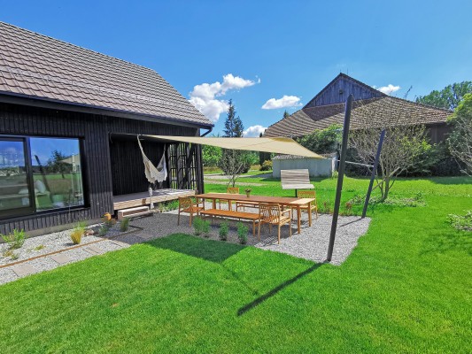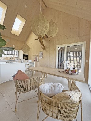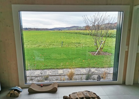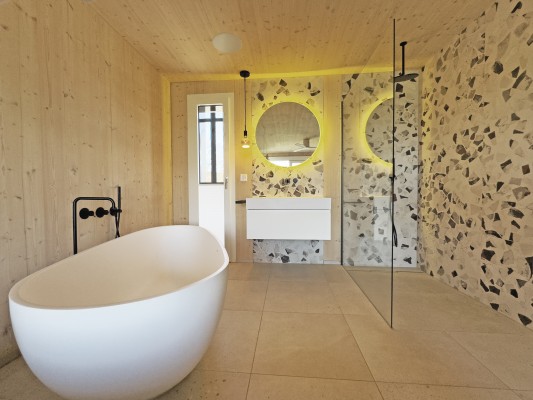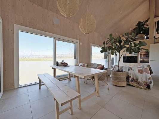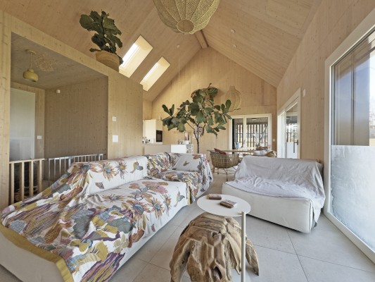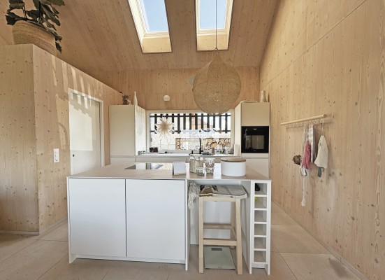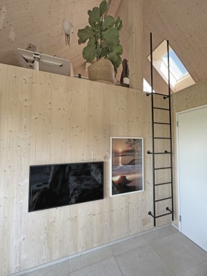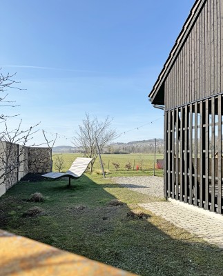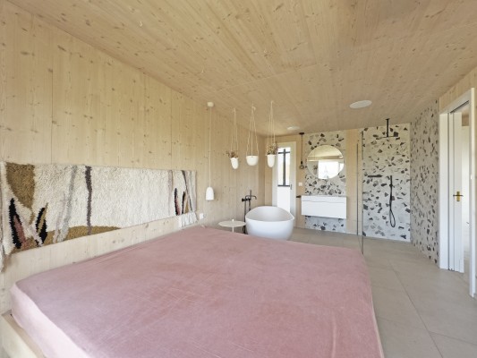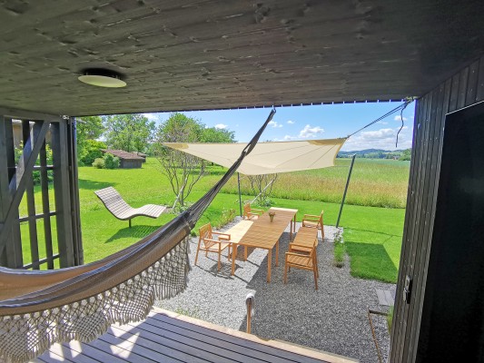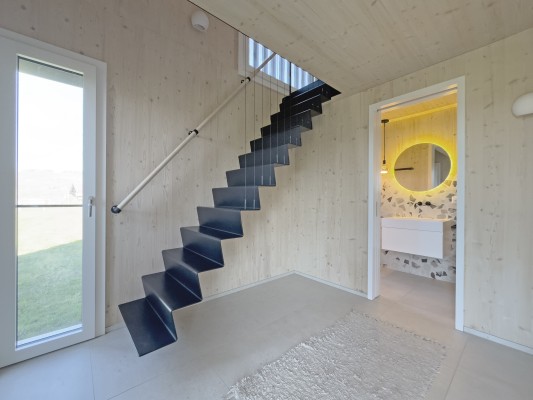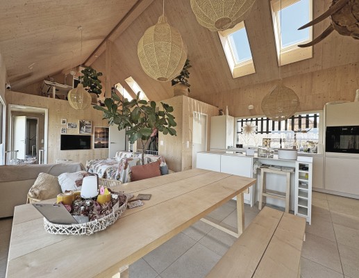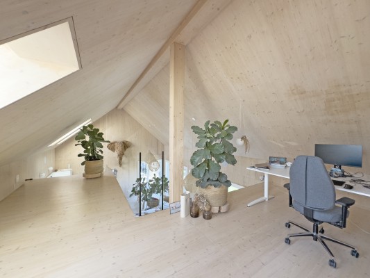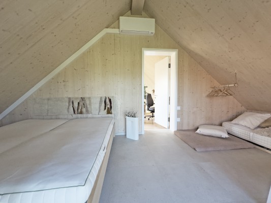 Das Obergeschoss ist über eine Stahltreppe erreichbar. Hier ist ein weiteres Zimmer sowie eine Galerie realisiert worden. Holz, Licht und Leichtigkeit sind Themen, die sich im ganzen Haus widerspiegeln. Man fühlt sich hier wohl und geerdet. In den wärmeren Monaten spielt sich das Leben im grossen Garten ab. Lauschige Plätze, eine gedeckte Loggia sowie ein Sitzplatz mit Sonnensegel laden zum Verweilen ein.