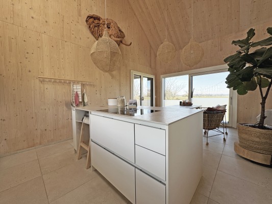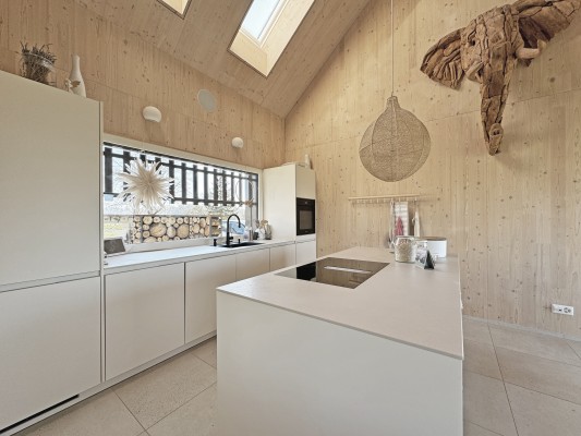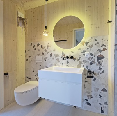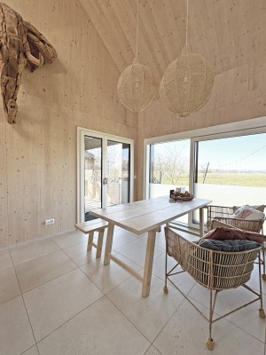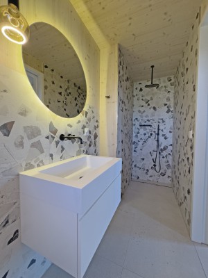 Das Haus weist einen spannenden Grundriss auf. Im Erdgeschoss der Eingangsbereich, die Küche, der Ess-/Wohnraum, ein Gäst-WC, ein Zimmer mit Bad/Dusche sowie eine separate Dusche/WC im Hausteil gegen Nordosten.