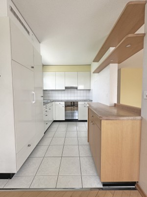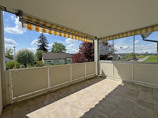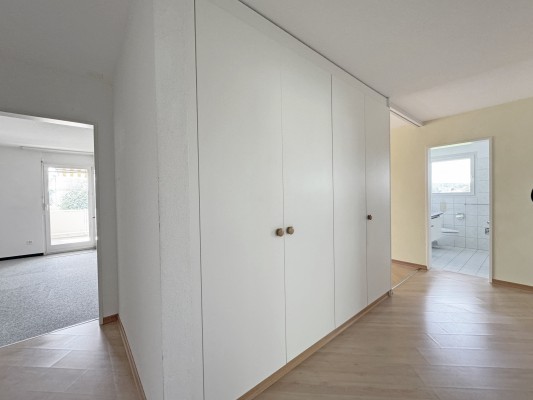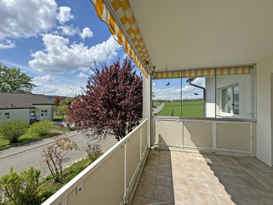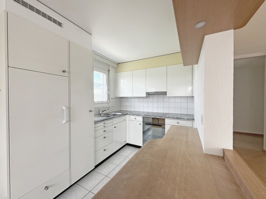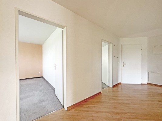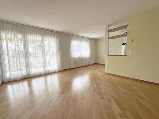 Die Wohnung im 1. Stock verfügt über 4.5 Zimmer, einen grossen Balkon und einen Werkraum im Keller und weist eine Fläche von ca. 90 m2 aus. Der Ausbau entspricht nicht mehr ganz dem heutigen Standard – eine sanfte Renovation steht an.