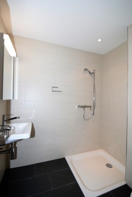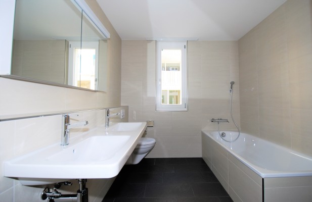 Das Badezimmer ist zeitgemäss mit Badewanne und WC, Doppel-Lavabo ausgestattet. Eine separate Gästetoilette mit Dusche steht ebenfalls zur Verfügung. Waschmaschine und Tumbler sind im Bad untergebracht.