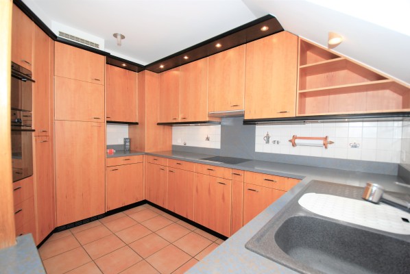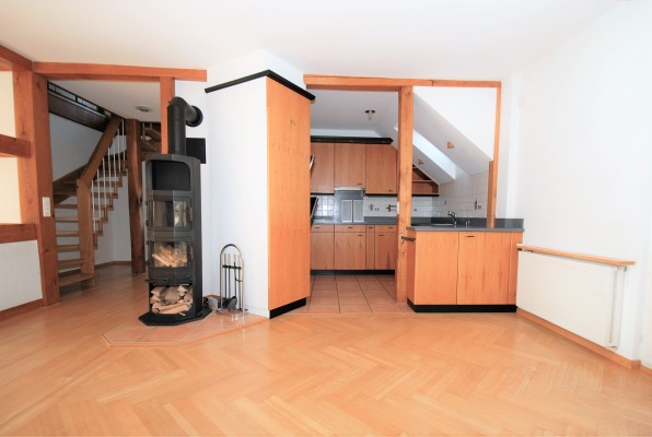 Die Wohnung ist ein Unikat und besticht durch ihre spezielle Raumaufteilung, durch die verschiedenen Baumerkmale und die unkonventionellen Raumhöhen. Die offene Küche mit Zugang zur Terrasse, das Wohnzimmer mit angrenzendem Büro- oder Hobbyraum und ein Badezimmer befinden sich auf der Wohnebene. Die Küche ist mit den üblichen Standard-Geräten ausgestattet. Die Bodenbeläge (Parkett oder Plattenboden) sind pflegeleicht. Ein Schwedenofen wärmt die Räume in der Übergangszeit.