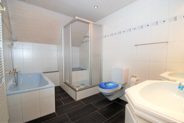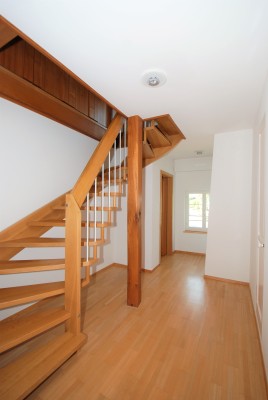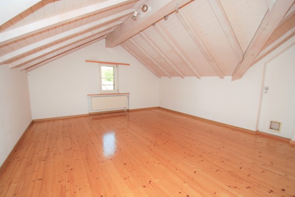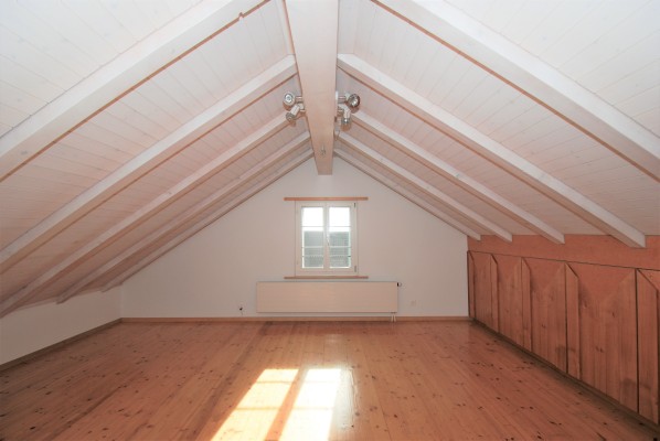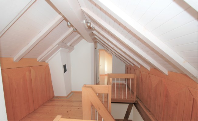 Im Obergeschoss sind drei Zimmer und ein Bad mit Dusche eingebaut worden. Im Kniestock wurden nicht weniger als 18 Einbauschränke realisiert, die mehr als genügend Stauraum bieten. Die Raumhöhen im Flur und im Eingang zum hellen Zimmer gegen Westen sind etwas gewöhnungsbedürftig (1.80 – 1.90 m). Ein Estrichraum ist über ein gemeinsam nutzbares Studio erreichbar. Der helle Parkett zieht sich vom Flur in alle Zimmer, die Balken und Decken wurden weiss lasiert.
