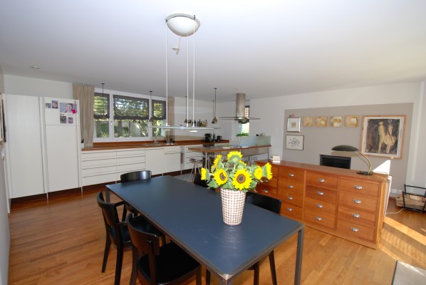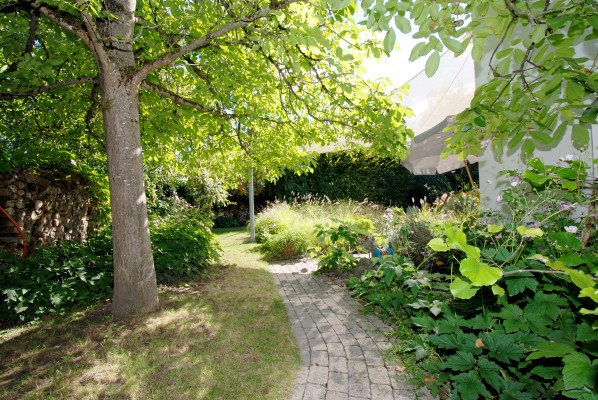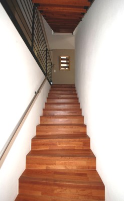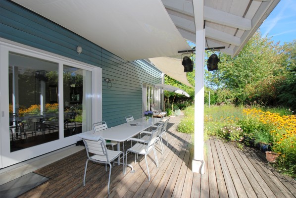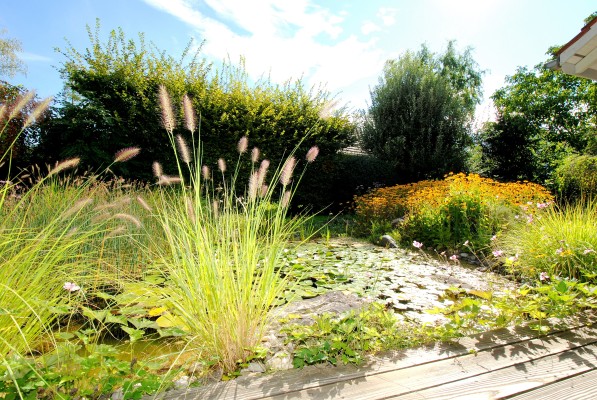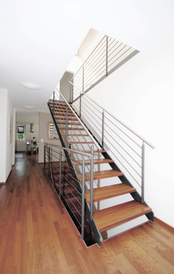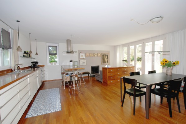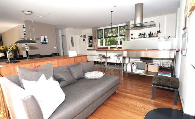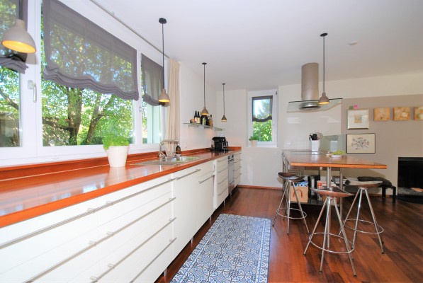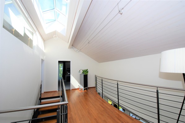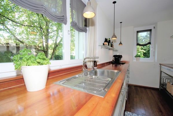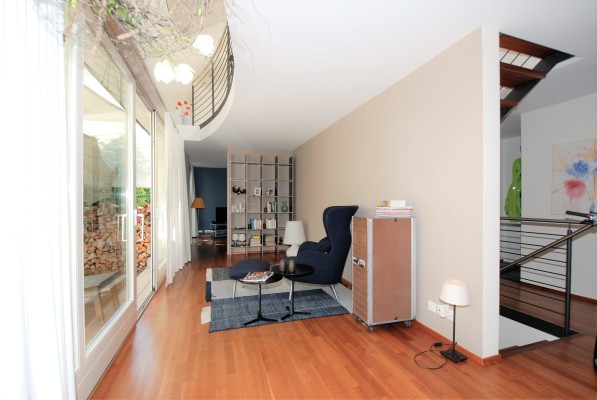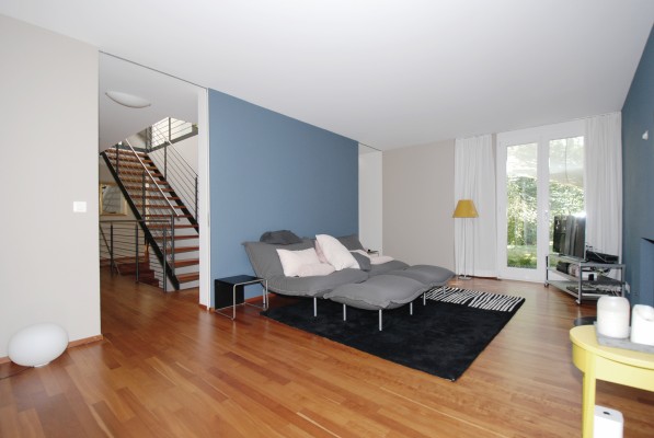 Eine stilvolle Holztreppe (amerik. Kirschbaum/Stahlwangen) führt ins Erdgeschoss mit dem Wohn-/Essbereich und der Küche. Vom offen gestalteten Wohnbereich gelangen Sie in den grünen Garten mit Sitzplatz und wunderschönem Biotop.