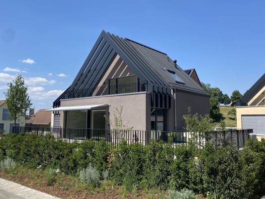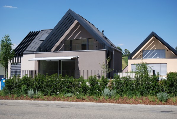 Mit der Einfamilienhaussiedlung SUNNWIESLI entstanden an zentraler, leicht erhöhter Lage, 10 Ein-familienhäuser in ökologischer und behaglicher Bauweise (MINERGIE).