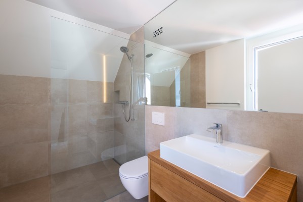 Das Raumangebot beinhaltet nebst einem grosszügigen Wohn-/Essgeschoss mit direktem Zugang zum Sitzplatz, ein Zimmer im Erdgeschoss welches auch gute als Büro oder Praxisraum benutzt werden kann. Praktisch auch das gleich daneben liegende Badezimmer mit Dusche.