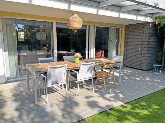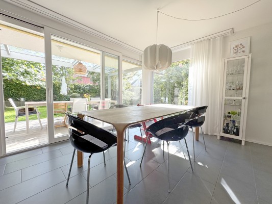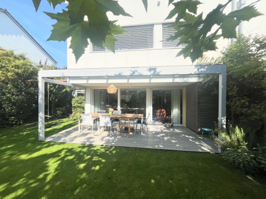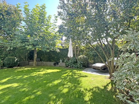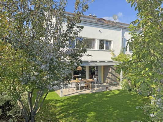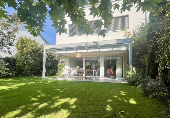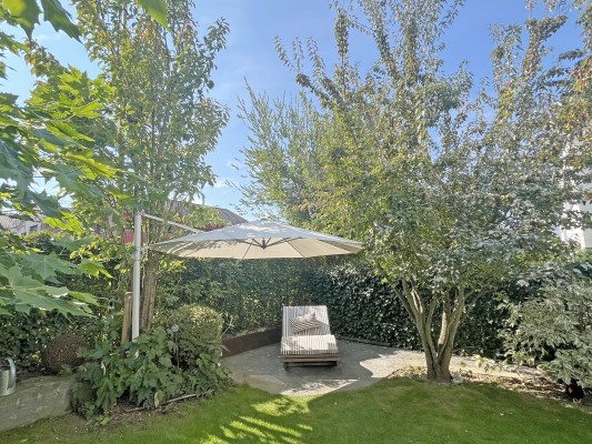 Das Haus ist eingebettet in einen liebevoll angelegten Garten. Bäume und blühende Sträuche rahmen das Grundstück ein und verleihen dem Anwesen eine ruhige Atmosphäre. Unter der Pergola oder auf dem lauschigen Sitzplatz lässt sich der Blick ins Grüne in aller Ruhe geniessen.