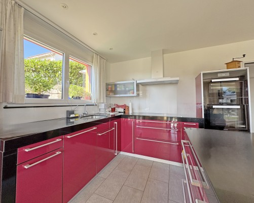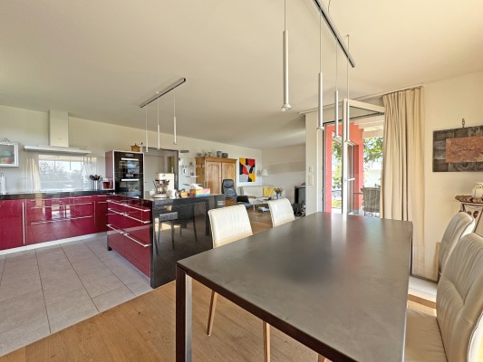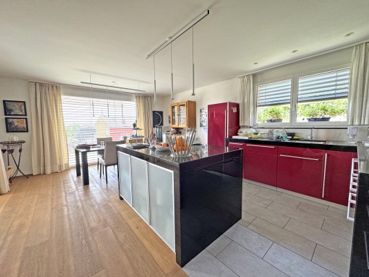 Das gepflegte 5.5-Zimmer-Haus überzeugt mit grossen Fensterfronten, die viel Tageslicht hinein- und den Blick hin zu einem fantastischen Alpenpanorama schweifen lassen. Das Wohn-/ Esszimmer mit der praktischen Küche mit Arbeitsinsel ist gemütlich und übersichtlich.