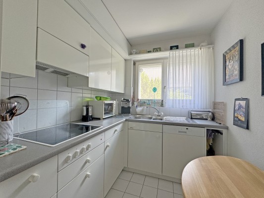 Das Wohn-/Esszimmer mit direktem Zugang zum Balkon wird durch die raumhohen Fenster erhellt. Die Küche verfügt über die üblichen Gerätschaften.