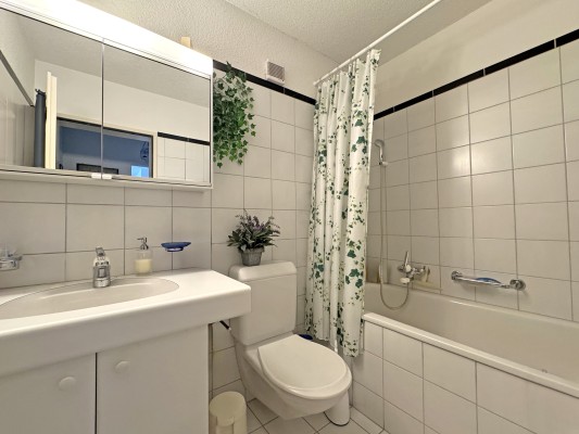 Ein geräumiges Schlafzimmer und ein zeitloses Bad mit Badewanne, WC und Lavabo mit Unterschrank runden das Wohnangebot ab.