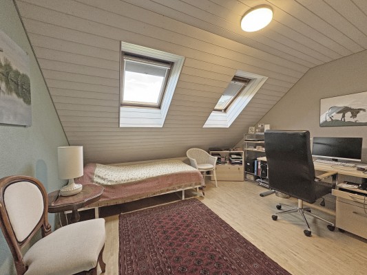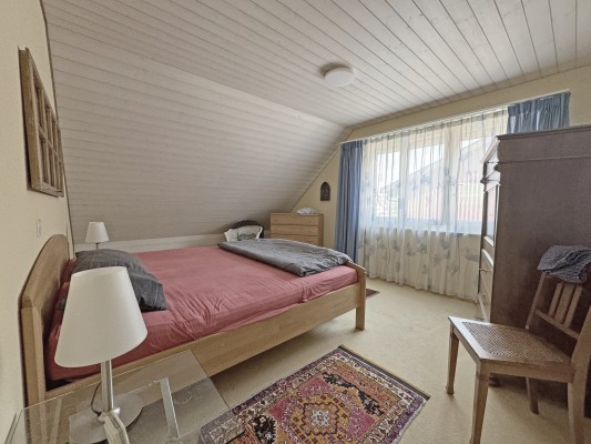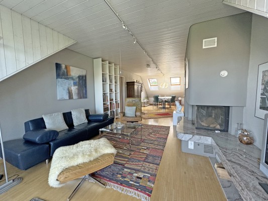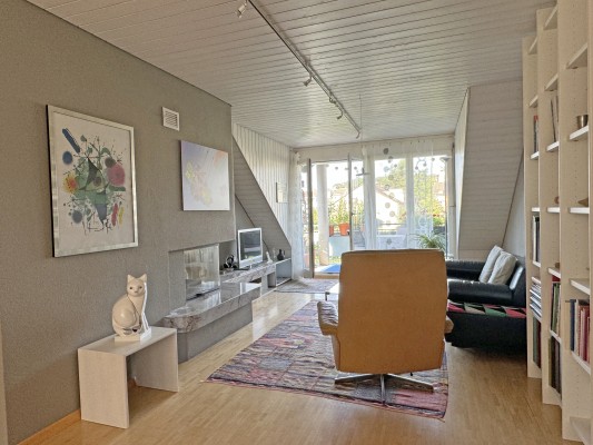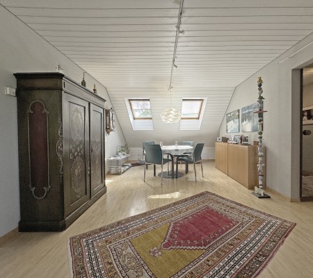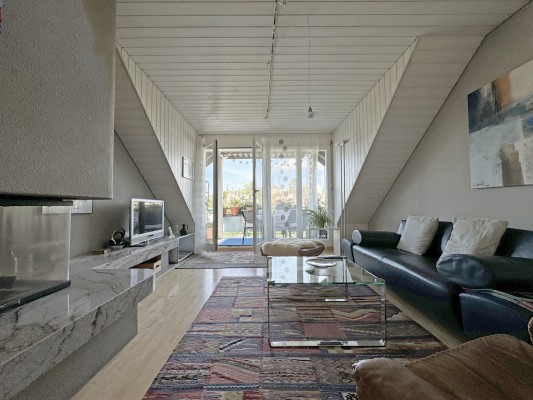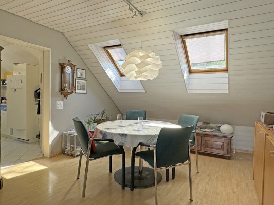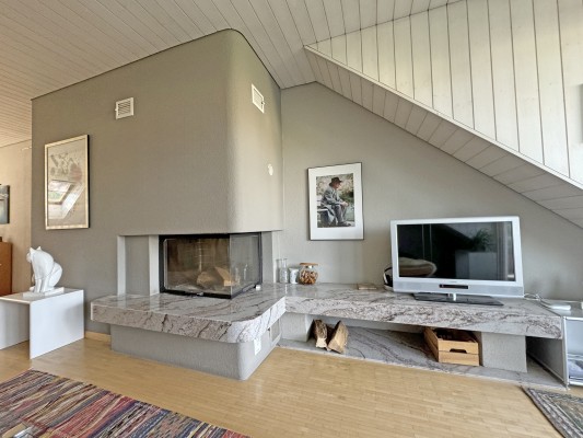 Das Wohn-/Esszimmer mit direktem Zugang zum Balkon ist mit einem Warmluft-Cheminée ausgestattet und wird von grossen Dachflächenfenstern mit Tageslicht durchflutet.