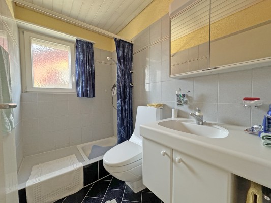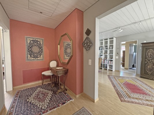 Die praktische Wohnung mit interessantem Grundriss befindet sich im 2. Obergeschoss. Über das Treppenhaus erreichen Sie Ihr Zuhause. Das Entrée ist geräumig und offen. Ein Studio sowie eine Nasszelle mit Badewanne und Lavabo befinden sich links bzw. rechts davon.