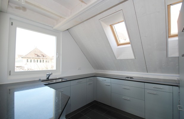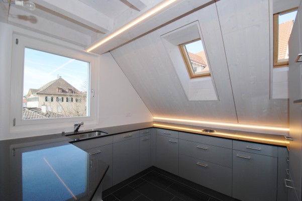 Die clever konzipierte Küche, ein für den stylische Hochtisch an welchem der Morgenkaffee genossen wird, ein Halbgeschoss höher das "Esszimmer" mit Weitsicht in welchem es sich "Dinnieren" lässt, hier schon eingebaut der praktische Kniestockschrank.