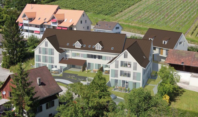 Die Wohnüberbauung an attraktiver Südwesthanglage liegt nahe am Dorfzentrum. Sei es der Volg, der Metzger, die Gemeindeverwaltung, nur in wenigen Gehminuten sind Sie Mitten im Geschehen.