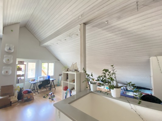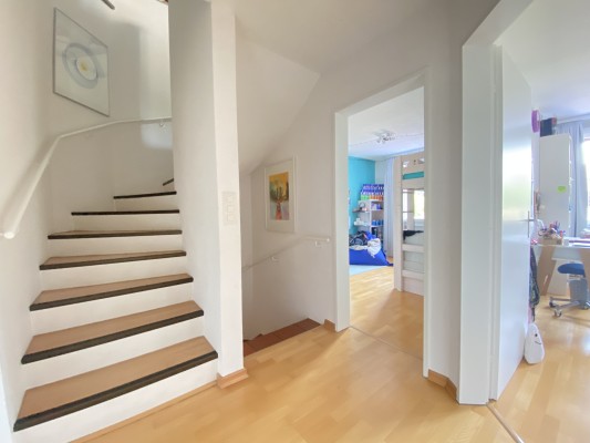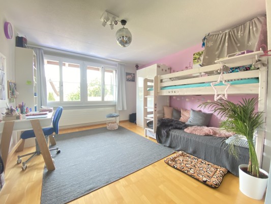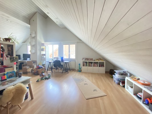 Die Liegenschaft ist geräumig und klar strukturiert. Im Parterre findet das Leben statt. Wohnen/Essen, Küche und Gäste-WC sind hier zu finden. Ein gedeckter Gartensitzplatz lädt zum Verweilen ein, der Garten zum Spielen. Die Schlafzimmer sowie die beiden Bäder, für die Kinder mit Badewanne und bei den Eltern «en Suite» mit Dusche im Obergeschoss sind hell und praktisch. Das Dachgeschoss dient als Spielzimmer oder Büro. Hobbyraum, Technik und Waschen/Trocknen wurden wie üblich im Keller realisiert. Im offenen Unterstand mitten in der gut angelegten und kindertauglichen Siedlung hat es Platz für Velos und andere «Vehikel».