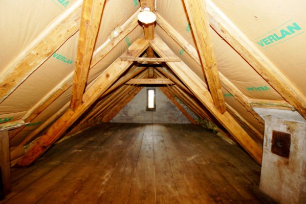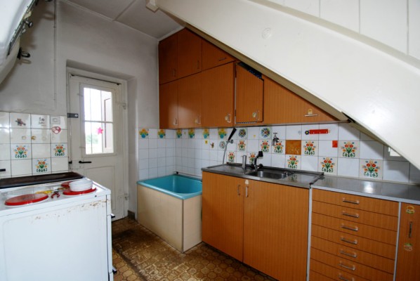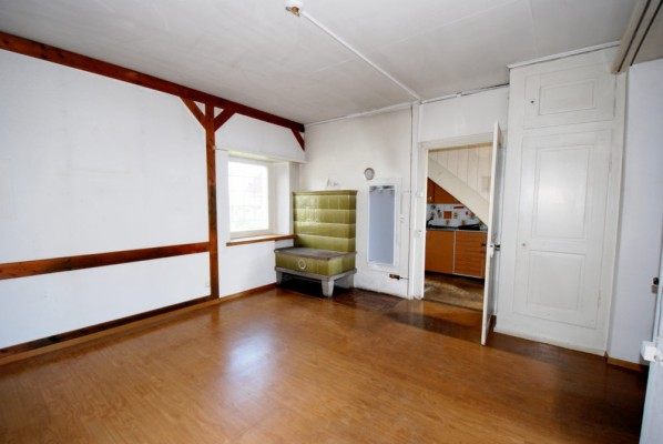 Sie betreten das Haus von der Strasse her über den Vorbau und befinden sich direkt im Wohn-/Esszimmer. Die Küche ist nicht mehr nutzbar und muss erneuert werden. Über eine antike Holztreppe gelangen Sie in den oberen Stock. Zwei kleine Zimmer und eine Toilette, mehr hat diese Etage nicht zu bieten.