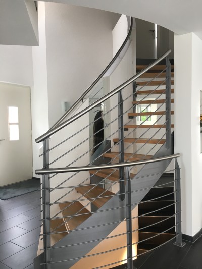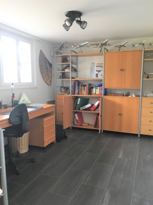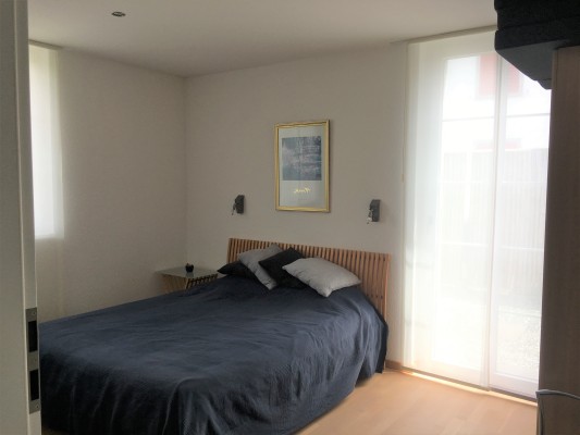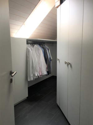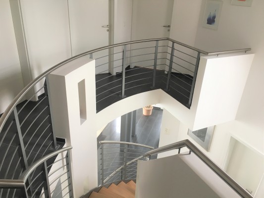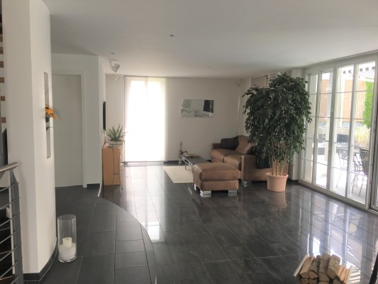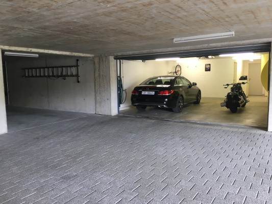 Wenn Sie nach Hause kommen, parken Sie in der grossen Doppelgarage Ihr Auto und befinden sich bereits im Untergeschoss Ihres Hauses. Neben dem Technikraum und den üblichen Kellerräumen ist hier ein helles Zimmer/Büro mit Fenstern gegen Norden realisiert worden. Eine moderne Treppe führt ins Erdgeschoss.