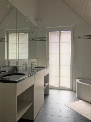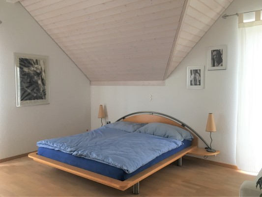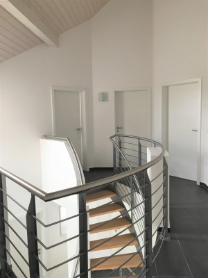 Das markante, offene Treppenhaus führt Sie ins Obergeschoss. Drei Schlafzimmer, eine Ankleide sowie zwei attraktive Bäder laden zum Verweilen ein.