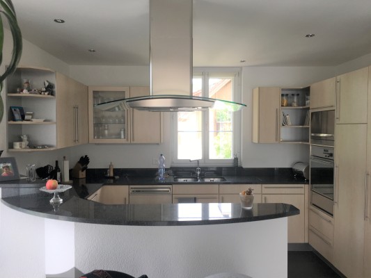 Hier zeigt sich Ihnen ein grosser Wohn-/Essbereich mit Cheminée. Die ganze Front gegen Süden ist mit raumhohen Fenstern versehen und bringt viel Licht in diesen Hausteil. Die Küche mit ihren hellen Holzfronten und der Granitabdeckung zeigt sich freundlich und lädt zum Kochen ein. Das Gäste-WC/Dusche und ein Zimmer - welches auch als Büro oder Gästezimmer genutzt werden kann - sind auch auf diesem Stock zu finden.