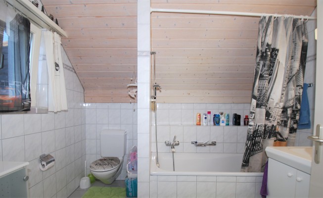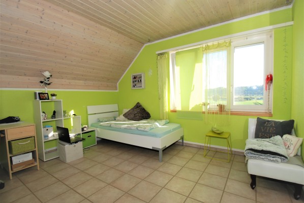 Im Obergeschoss finden Sie drei Schlafzimmer und eine Nasszelle mit Badewanne. Das grosse Zimmer hat einen Ausgang auf den geräumigen