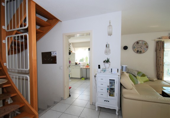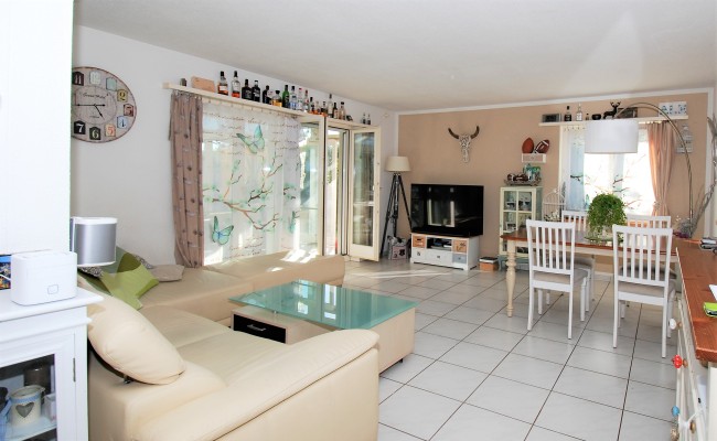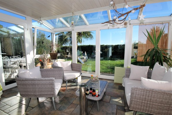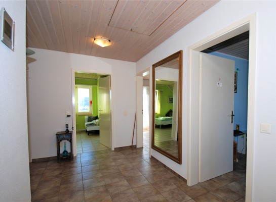 Der gedeckte Hauseingang führt ins Entrée, welches ein Zimmer und das Gäste-WC mit Dusche erschliesst. Eine verglaste Tür führt in den Wohnbereich und die Küche. Im nachträglich erstellten Wintergarten können Sie Gäste das ganze Jahr verwöhnen.