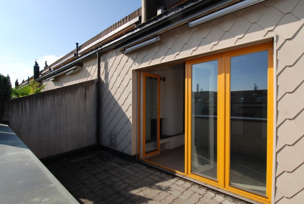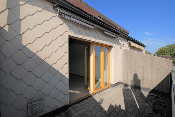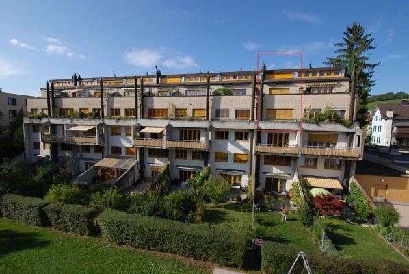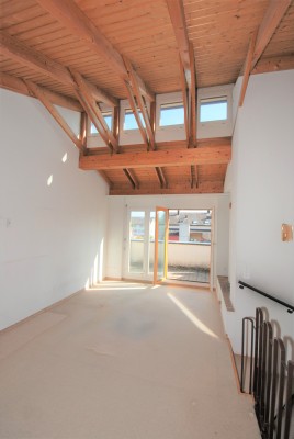 Über die Liftanlage oder die Aussentreppe gelangen Sie zum Wohnungseingang. Ein kleines Entrée mit Gäste-WC, die Küche, eine Essecke und ein Zimmer befinden sich auf dieser Wohnetage. Das Zimmer im Dachgeschoss kann als Schlaf- oder Wohnzimmer genutzt werden. Hier befindet sich auch das Bad mit Badewanne.